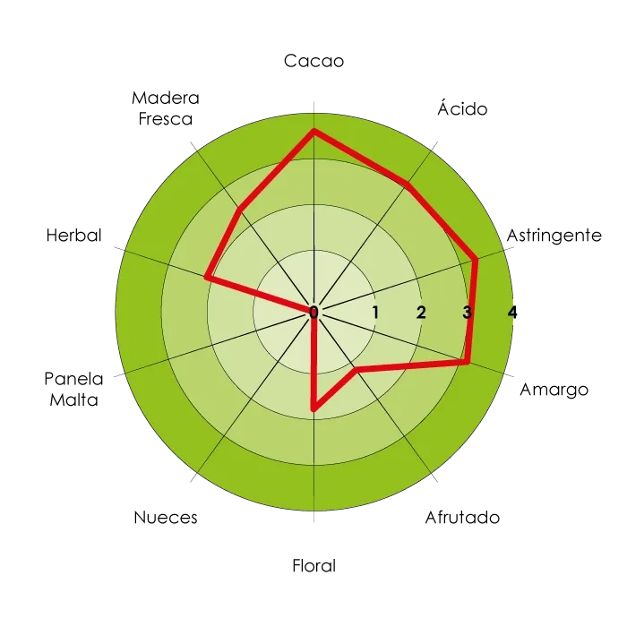«Muestra notas de un cacao híbrido con sabores de madera fresca, corteza y flores silvestres con aromas de bosque, notas perfumadas, sensaciones de ardiente y acholado»indicó la Ing. Ms. Gladys Ramos.